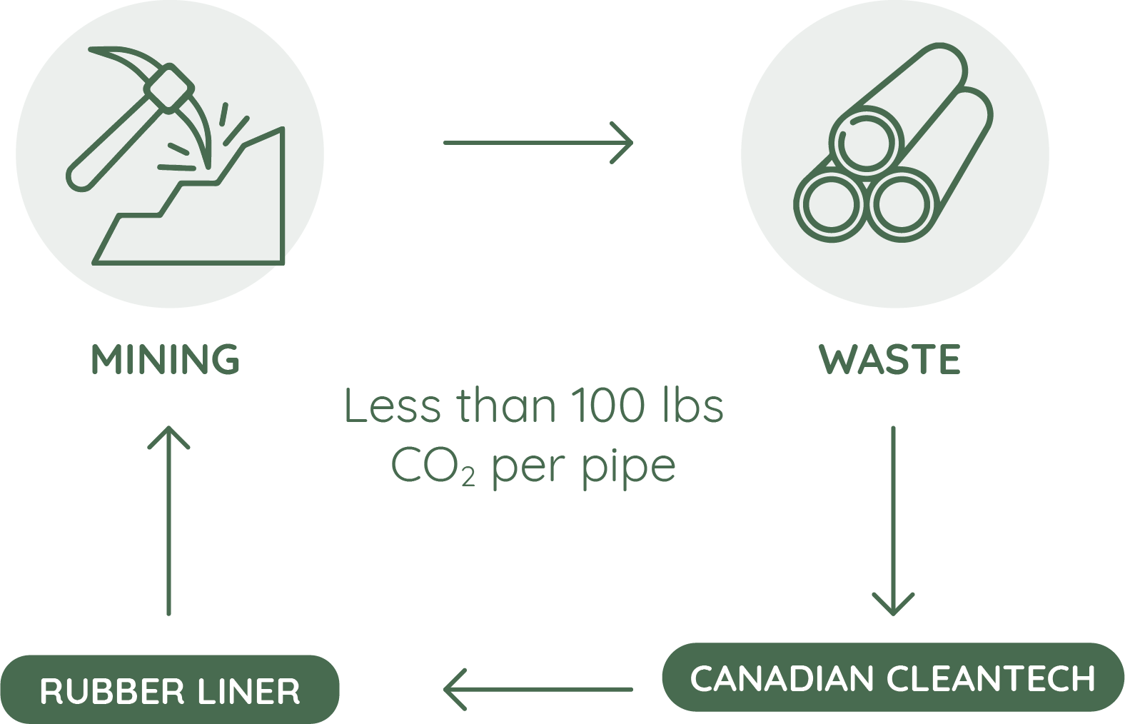 In mining, pipes with worn rubber linings are usually thrown away. However, the steel pipe still holds value and can be salvaged using the CCT process. This process removes the rubber, allows for new lining and reinstates the pipe for use. This creates a circular supply system for pipes and significantly reduces Scope 3 emissions.